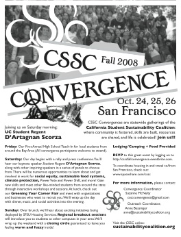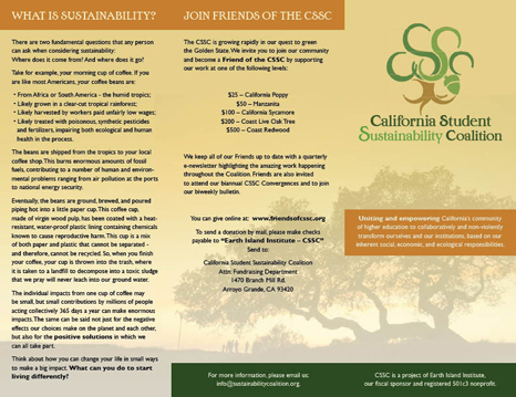 The California Student Sustainability Coalition has been working since 2002 to fundamentally shift the priorities of the California educational institutions towards ecological and social justice. I worked with the CSSC through the local UCLA chapter, E3: Economy, Ecology, Equity from 2005-2008; as a member of the statewide Executive Committee, I was responsible for identity development + print media (flyers, media kits, etc), and also provided critical feedback while developing a new website.