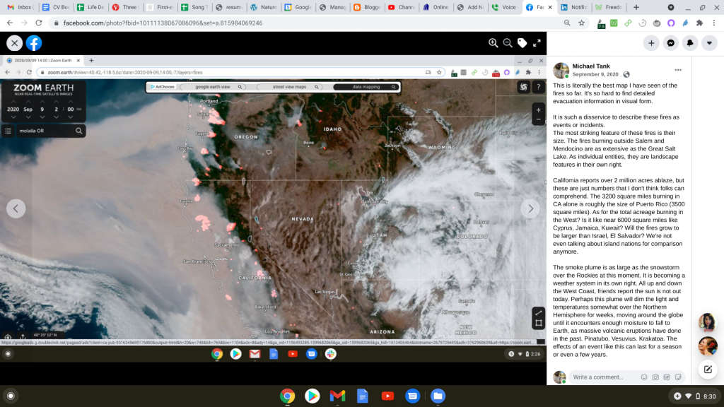 It breaks my heart to see the forests in the Bay Area and Northern California burning again. My father will likely lose his house. Many friends are evacuated. I and others are out of state in search of fresh air for compromised lungs.